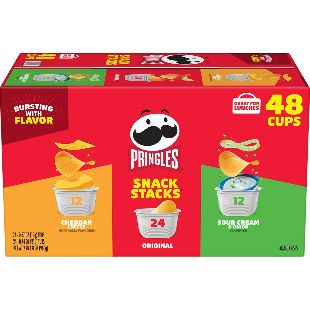 Deliciosas papas Pringles con sabores surtidos. ¡A que no puedes comer solo una! Hay un sabor favorito para todo el mundo en este paquete variado. Se adaptan perfectamente a las mochilas, las loncheras y las cestas de picnic, por lo que, ya sea el día del partido, el día de la playa, un día de fiesta o simplemente otro día de escuela, las Pringles satisfacen tus antojos de bocadillos.
